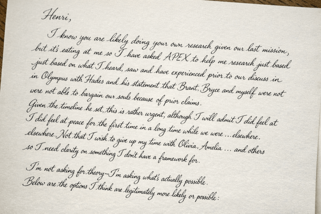 I know you are likely doing your own research given our last mission, but its eating at me so I have asked APEX to help me research just based on what I heard, saw and have experienced prior to our discuss in Olympus with Hades and his statement that Brant, Bryce and myself were not able to bargain our souls because of prior claims. Given the timeline he set, this is rather urgent, although I will admit I did feel at peace for the first time in a long time while we were . . . elsewhere. Not that I wish to give up my time with Olivia, Amelia . . . and others so I need clarity on something I don’t have a framework for. I’m not asking for theory—I’m asking what’s actually possible. Below are the options I think are legitimately more likely or possible, although not in any specific order, just based on our experiences.